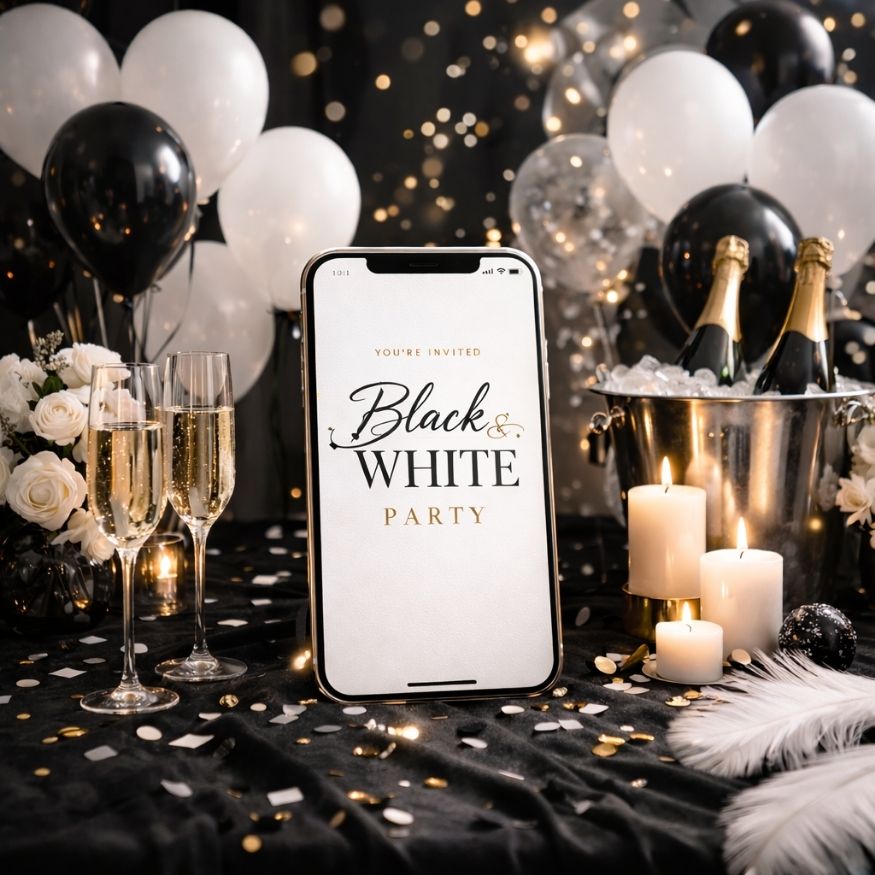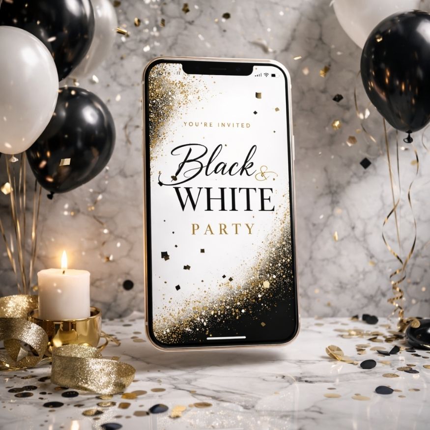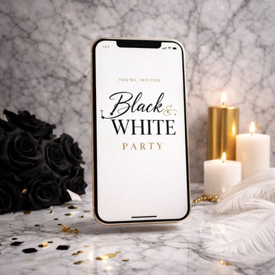 Eine digitale Einladung im Schwarz-Weiß Look harmoniert perfekt mit einem Dresscode „Black & White“. Gäste wissen sofort, welches Outfit erwartet wird. Dadurch entsteht ein stimmiges Gesamtbild auf deiner Party.