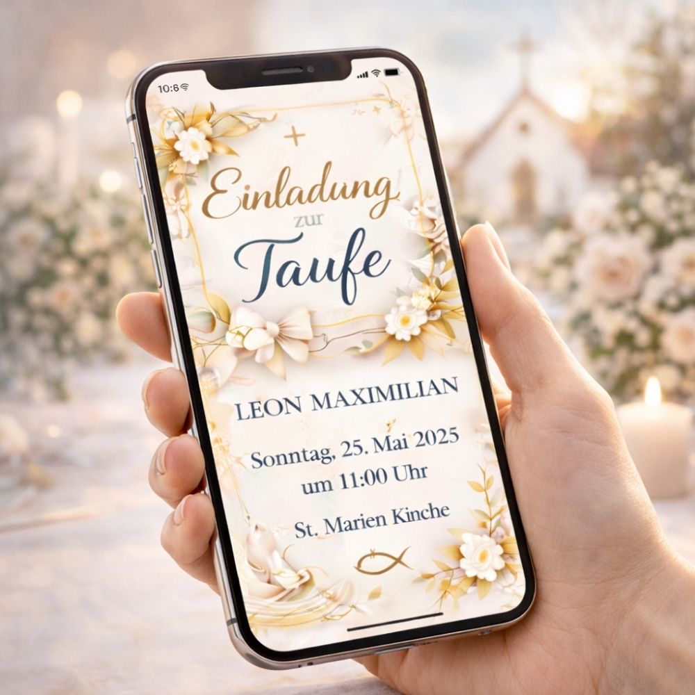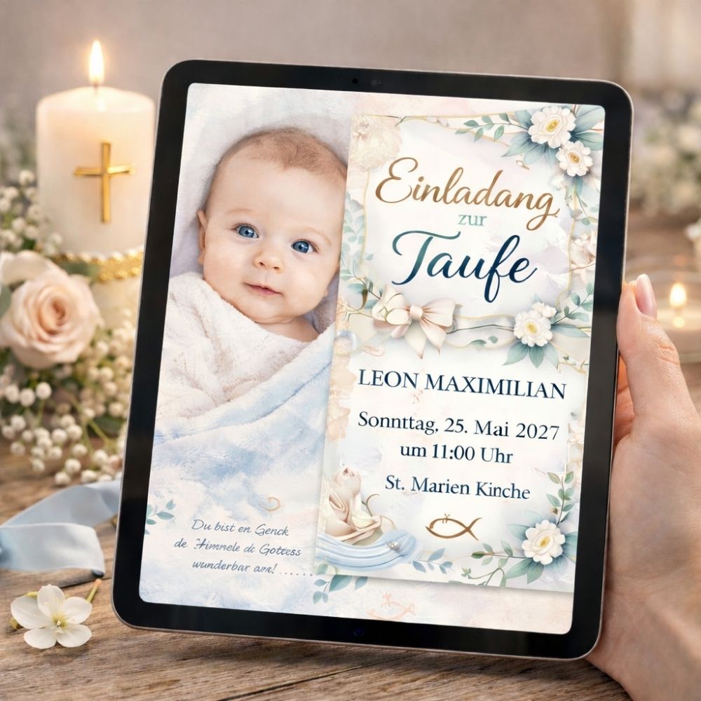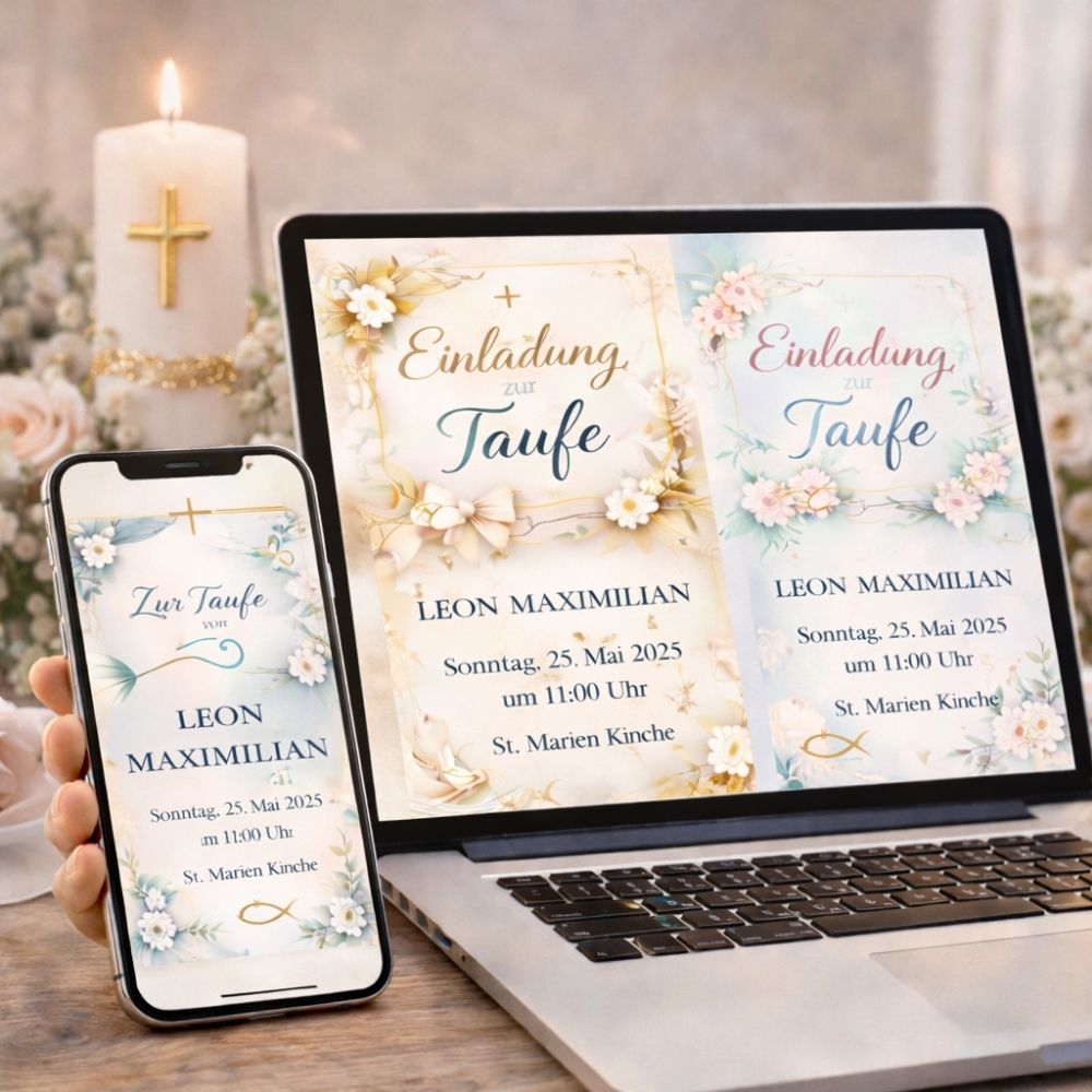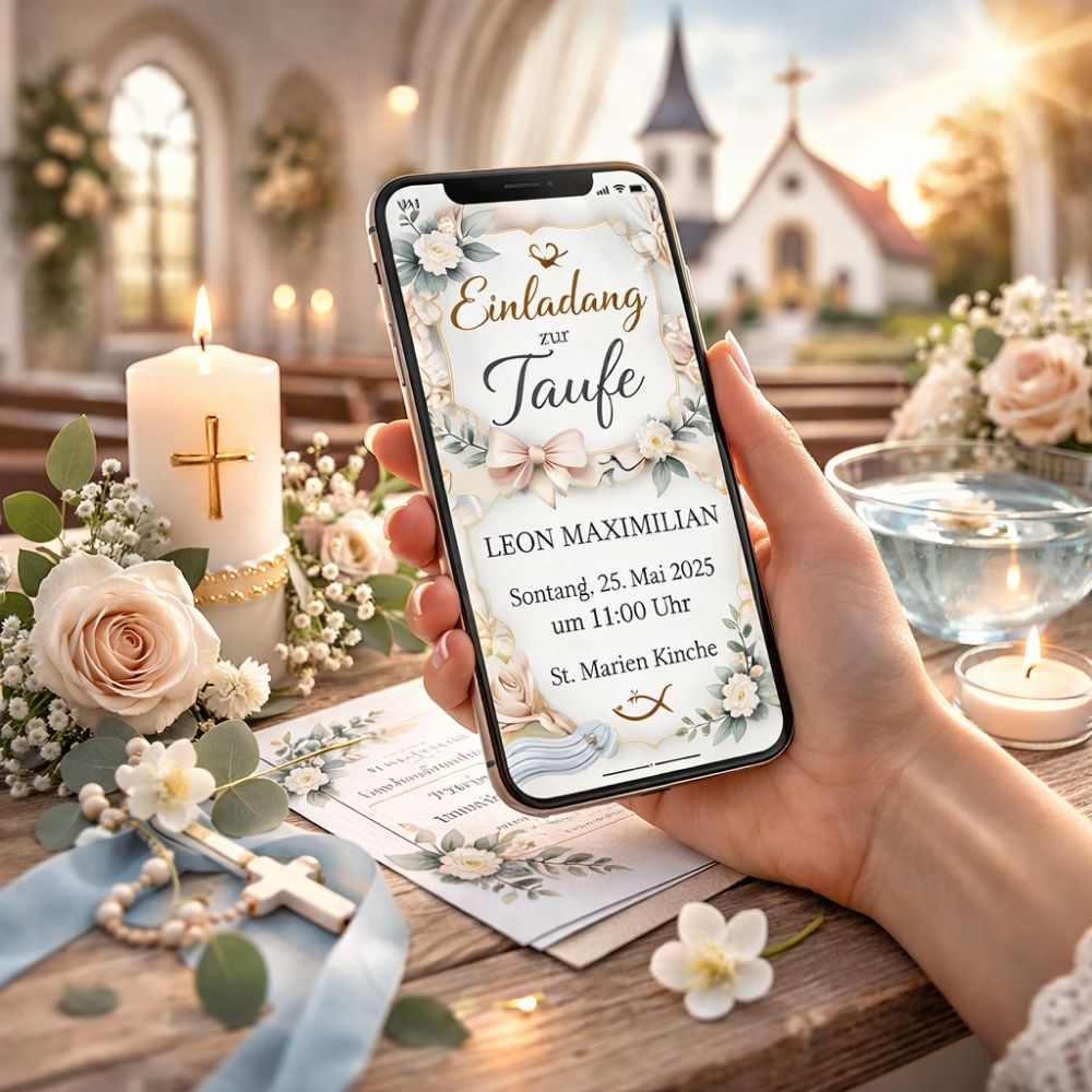 Eine digitale eCARD Einladung zur Taufe verbindet Emotion und Komfort. Statt lange auf Druck und Versand zu warten, kannst du deine Taufe Einladung online erstellen und sofort als WhatsApp Einladung, Email Einladung oder über soziale Medien verschicken. Die Online Einladung zur Taufe spart Zeit, Porto und Papier – perfekt für moderne Familien. Gleichzeitig bleibt sie stilvoll, persönlich und hochwertig gestaltet – ideal für Tauffeier, kirchliche Taufe oder freie Taufe.