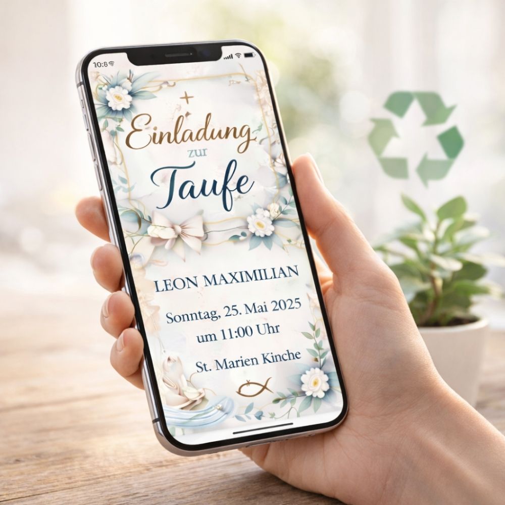 Definitiv. Eine papierlose Taufe Einladung reduziert Druck, Transportwege und Ressourcenverbrauch. Die digitale Einladung erstellen bedeutet weniger CO₂-Ausstoß und keinen Papiermüll. Gerade für junge Familien ist Nachhaltigkeit ein wichtiges Thema. Mit einer Taufe Einladung digital versenden setzt du ein bewusstes Zeichen für Umweltfreundlichkeit – ohne auf Stil und Eleganz zu verzichten.