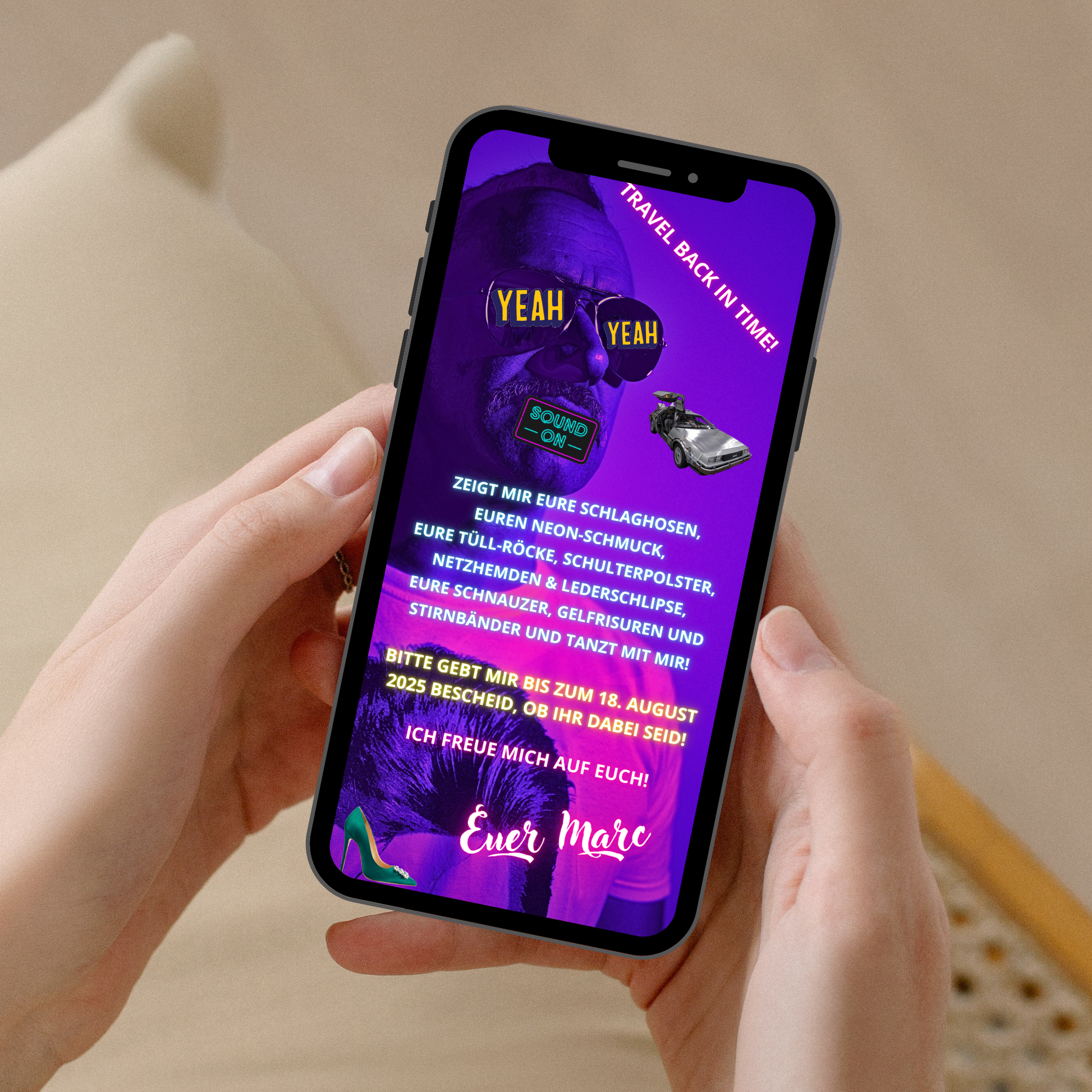 Dann ist diese digitale 80er Jahre Party Einladung wie für dich gemacht.