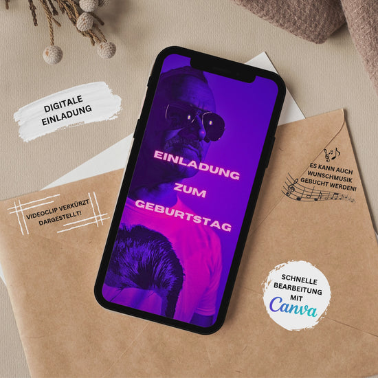 Bearbeite ganz einfach den Text, Bilder, Musik und Grafiken in der Vorlage bei Canva und sende das Video im Anschluss über WhatsApp an deine Gäste.