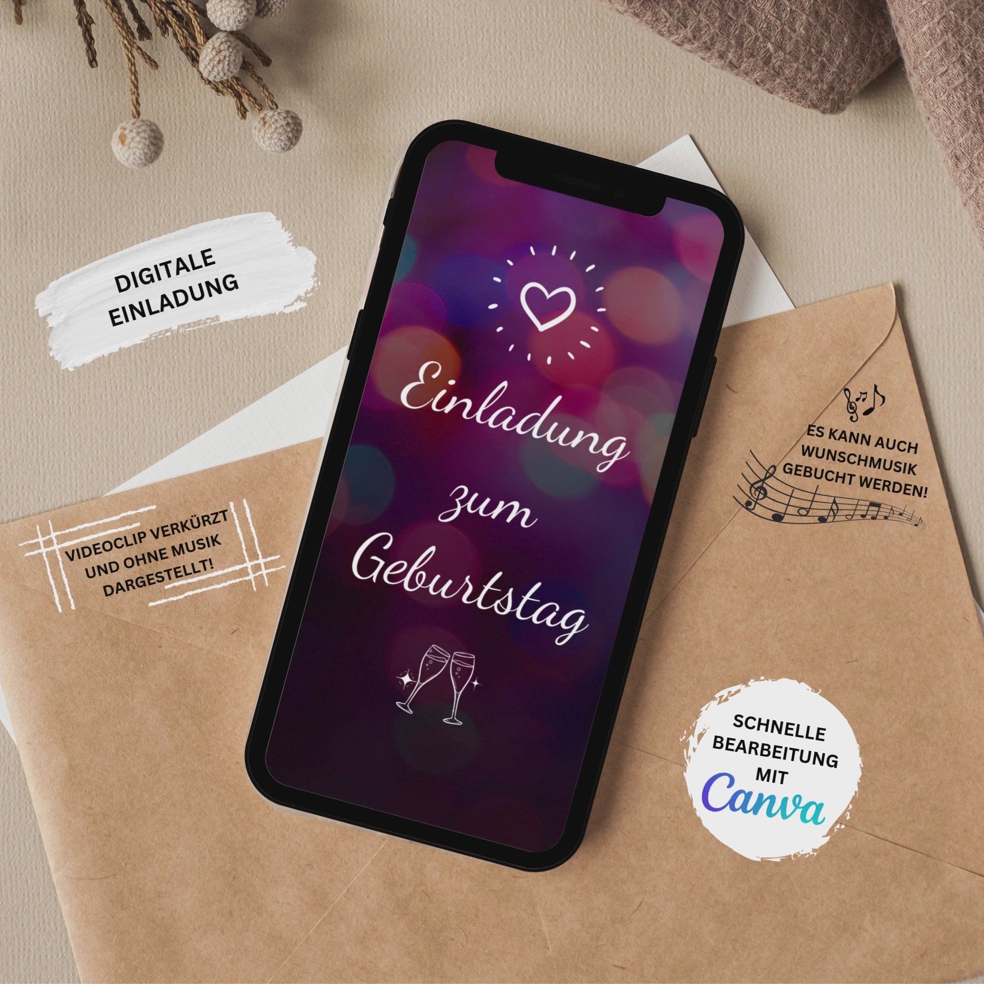Bearbeite ganz einfach den Text, Bilder, Musik und Grafiken in der Vorlage bei Canva und sende das Video im Anschluss über WhatsApp an deine Gäste.