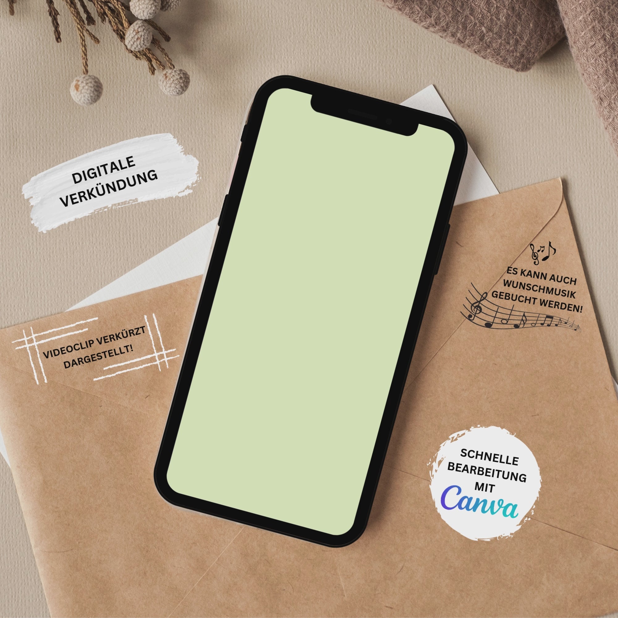 Bearbeite ganz einfach den Text, Bilder, Musik und Grafiken in der Vorlage bei Canva und sende das Video im Anschluss über WhatsApp an deine Gäste.