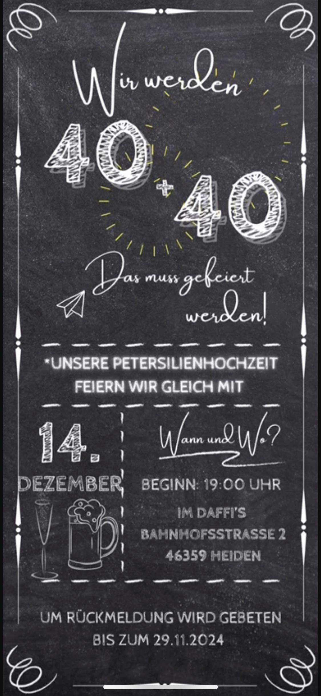 Du und eine Freundin oder ein Freund haben bald Geburtstag und möchtet gemeinsam feiern? Diese digitale Doppelgeburtstags-Einladungskarte ist die perfekte Lösung für euer Event. Die ansprechend gestaltete eCard lässt sich mühelos per Handy versenden und eignet sich für Geburtstagsfeiern in jedem Alter – ob 20, 30, 40, 50, 60, 70 oder älter. Mit ihrer modernen, animierten Gestaltung hinterlässt die Einladung bei deinen Gästen einen bleibenden Eindruck und wirkt zeitgemäß und durchdacht. Die eCard kann auch hervorragend mit anderen Anlässen wie Hochzeitstagen kombiniert werden, was sie zu einer vielseitigen Lösung macht. Durch den digitalen Versand sparst du Zeit, Kosten und Papier – und kannst die Karte beliebig oft wiederverwenden. Eine praktische und stilvolle Alternative zu klassischen Papiereinladungen.