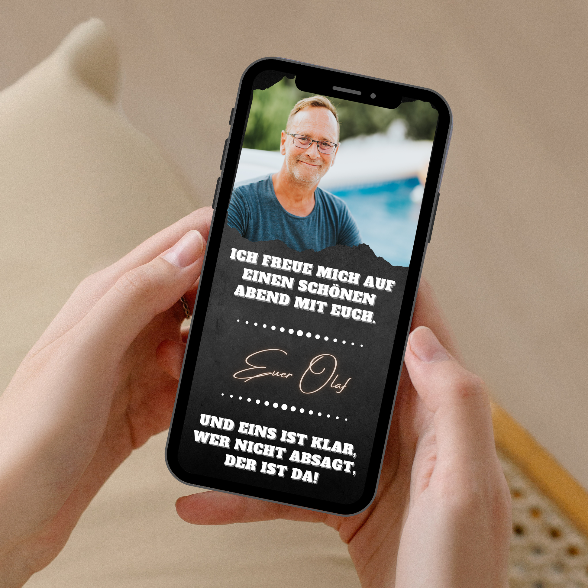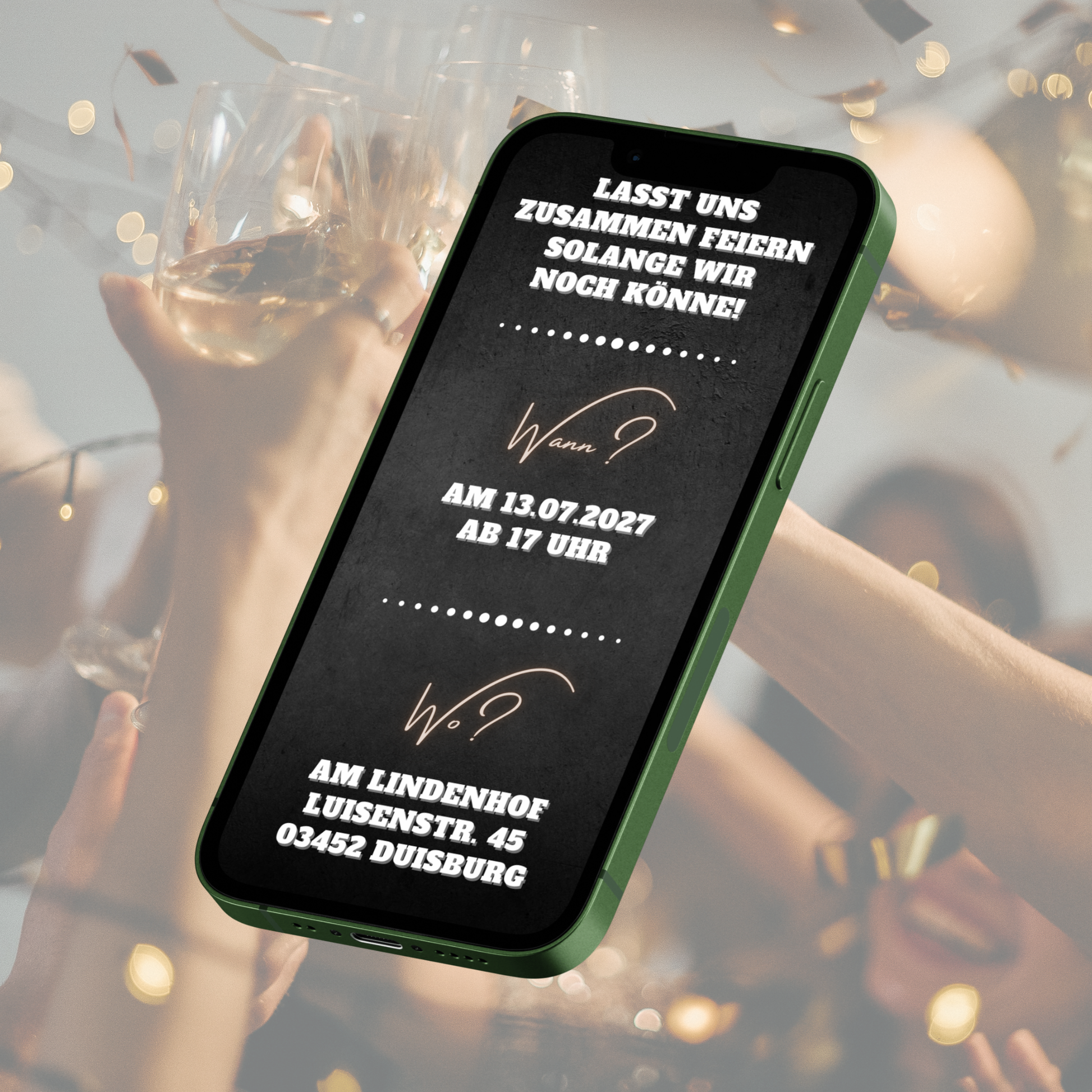Einfach den QR-Code abscannen und du siehst 1 zu 1 wie die Einladung auf deinen Handy aussehen könnte.