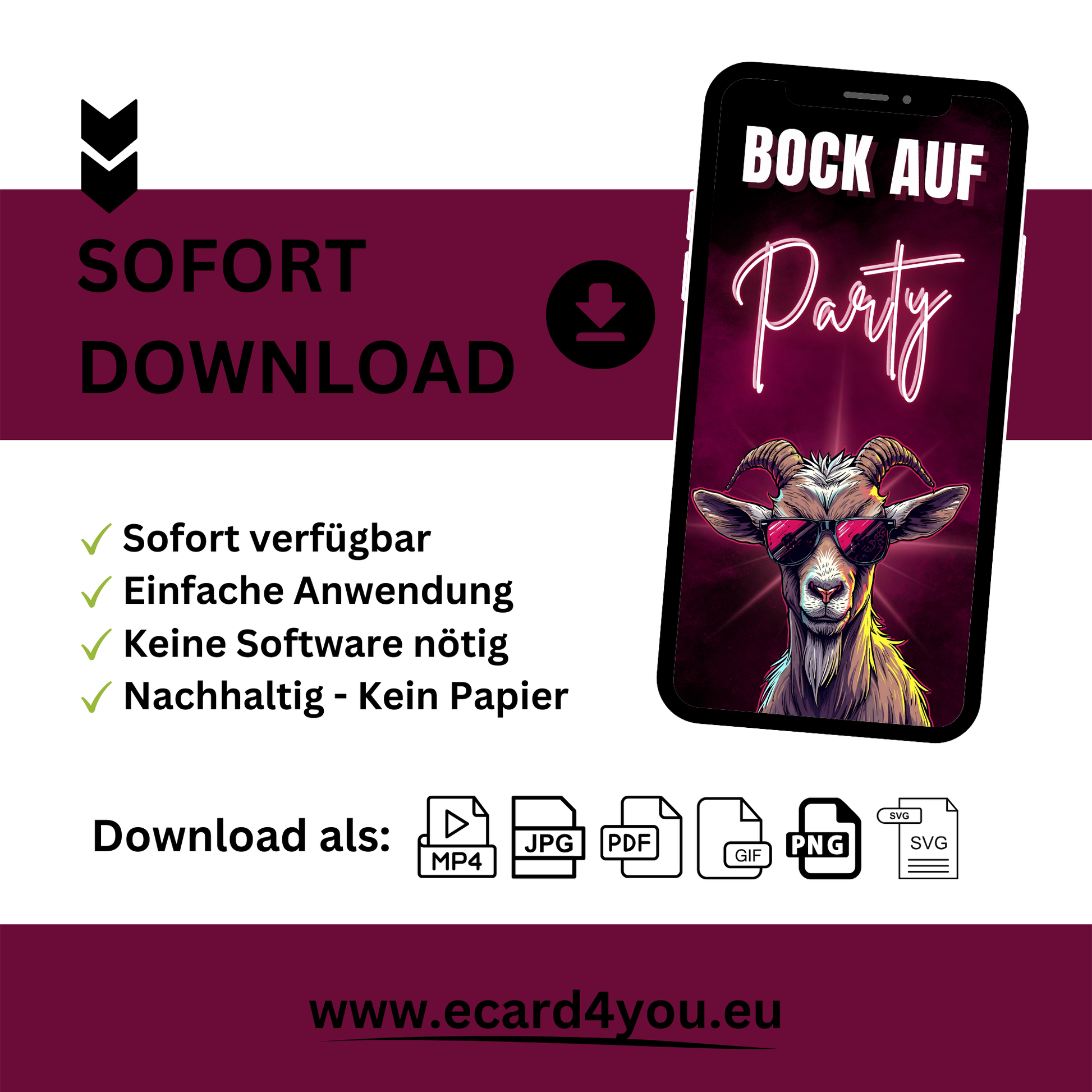 Dann solltest du dir diese digitale Geburtstagseinladung mit dem Spruch „Bock auf Party“ nicht entgehen lassen.