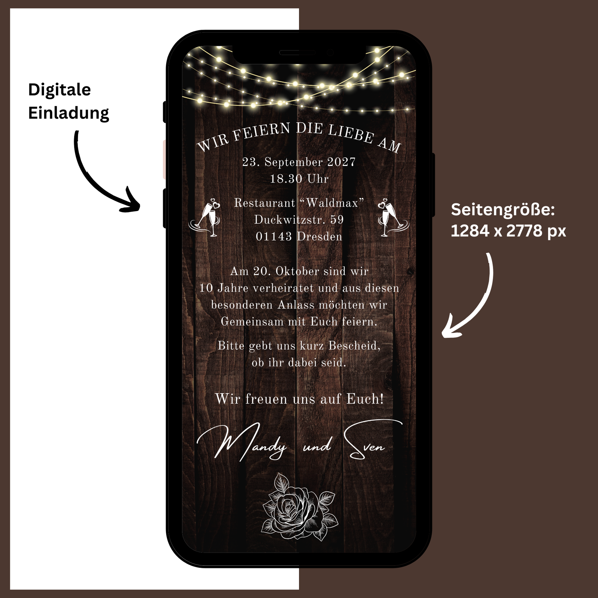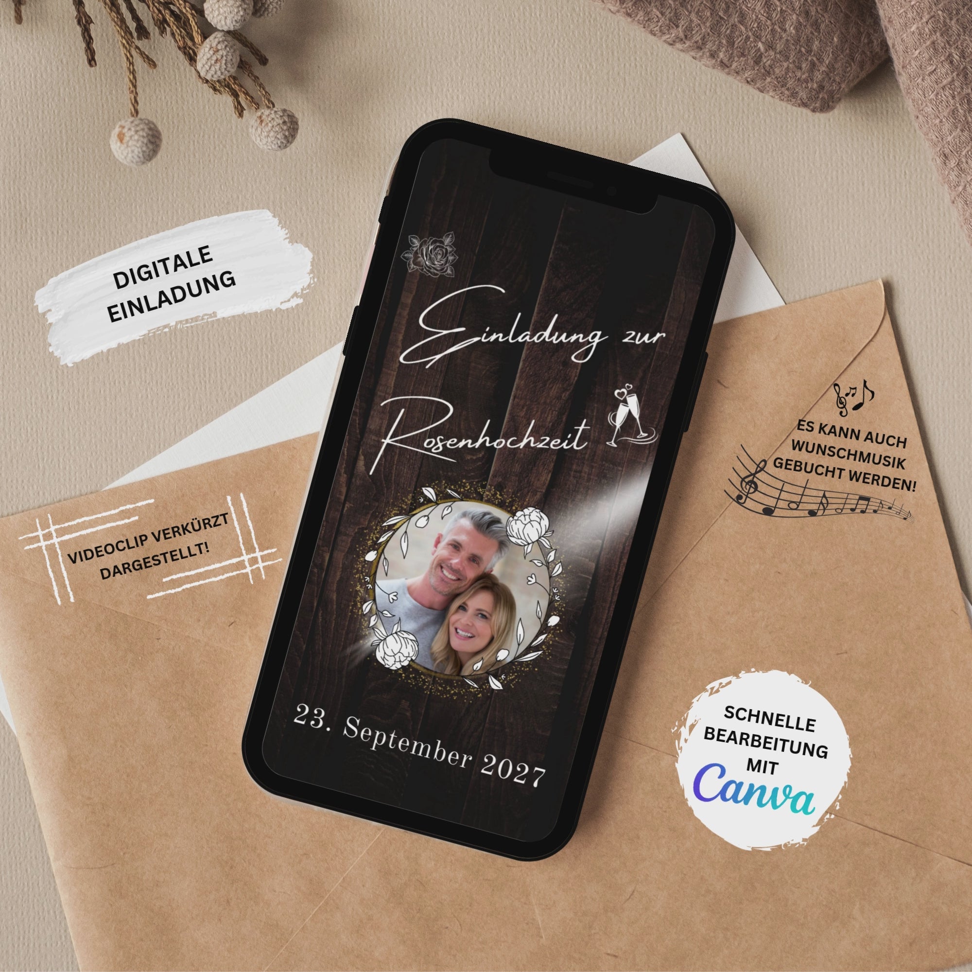 Eine moderne digitale Handy Einladung für eine Rosenhochzeit, oder auch Holzhochzeit.
