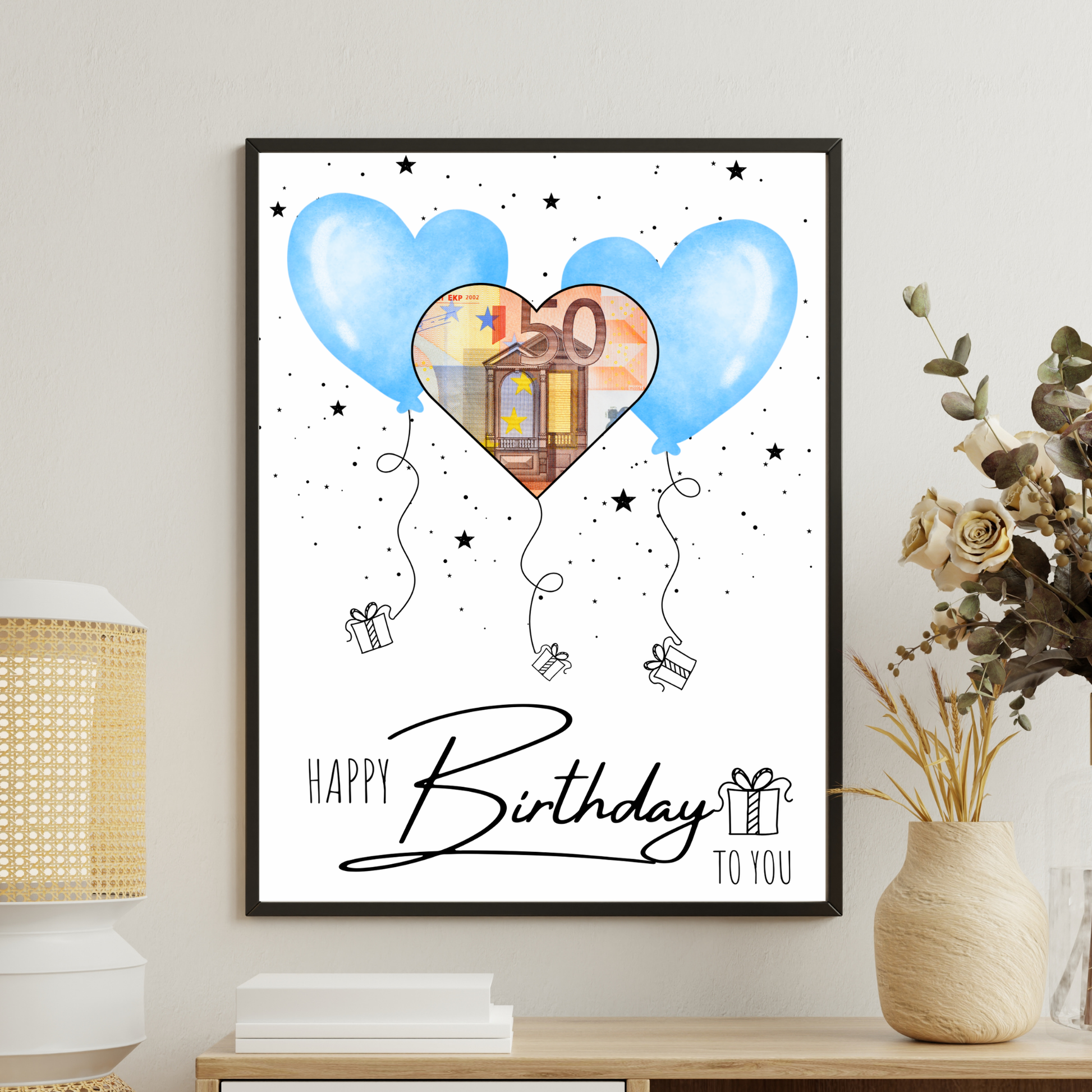 Geldgeschenk - Geschenk für den Geburtstag mit hellblauen Herzen