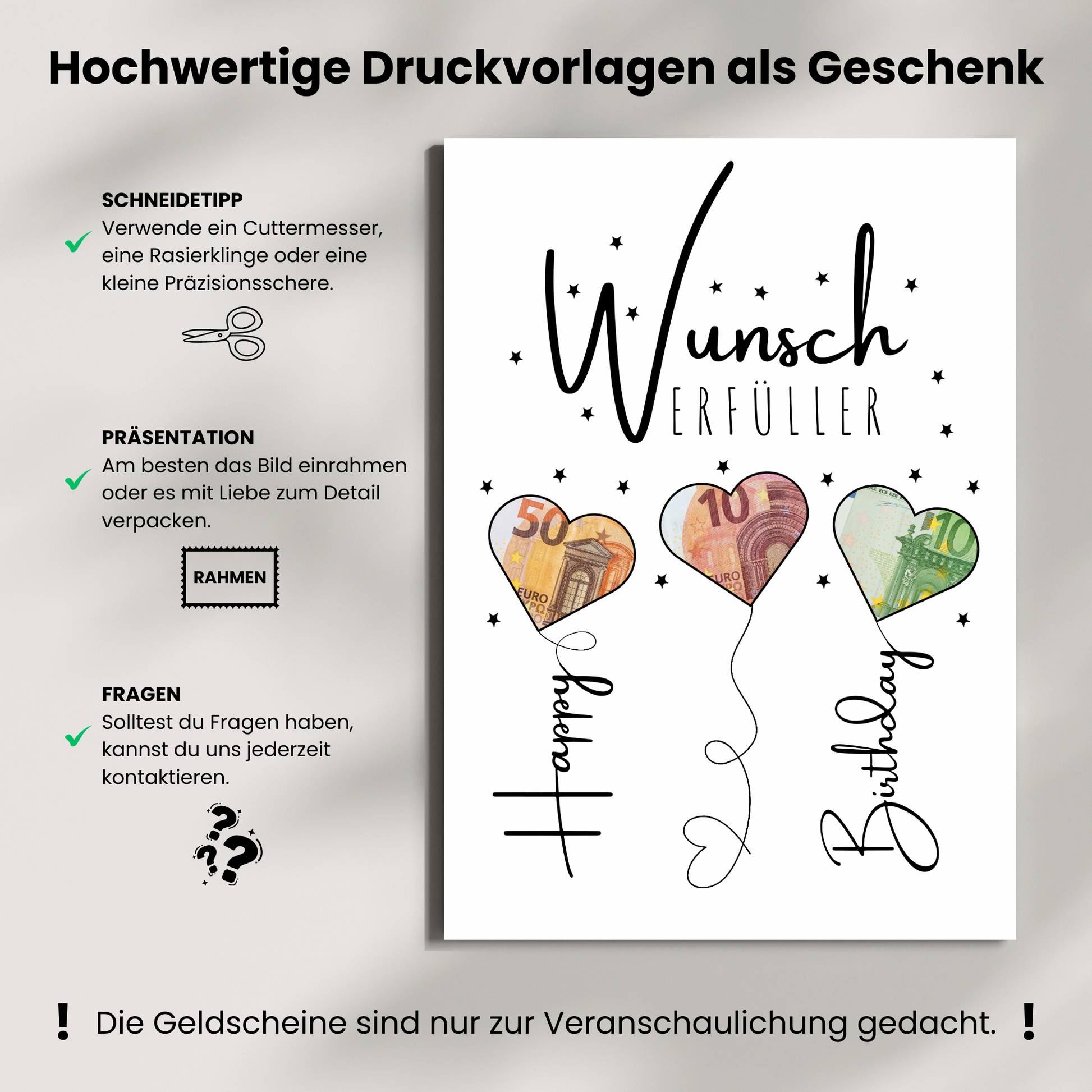 Wenn du ein spezielles, personalisiertes Geldgeschenk-Wunschmotiv haben möchtest, schreibe uns gerne eine Nachricht, damit wir es für dich erstellen können.
