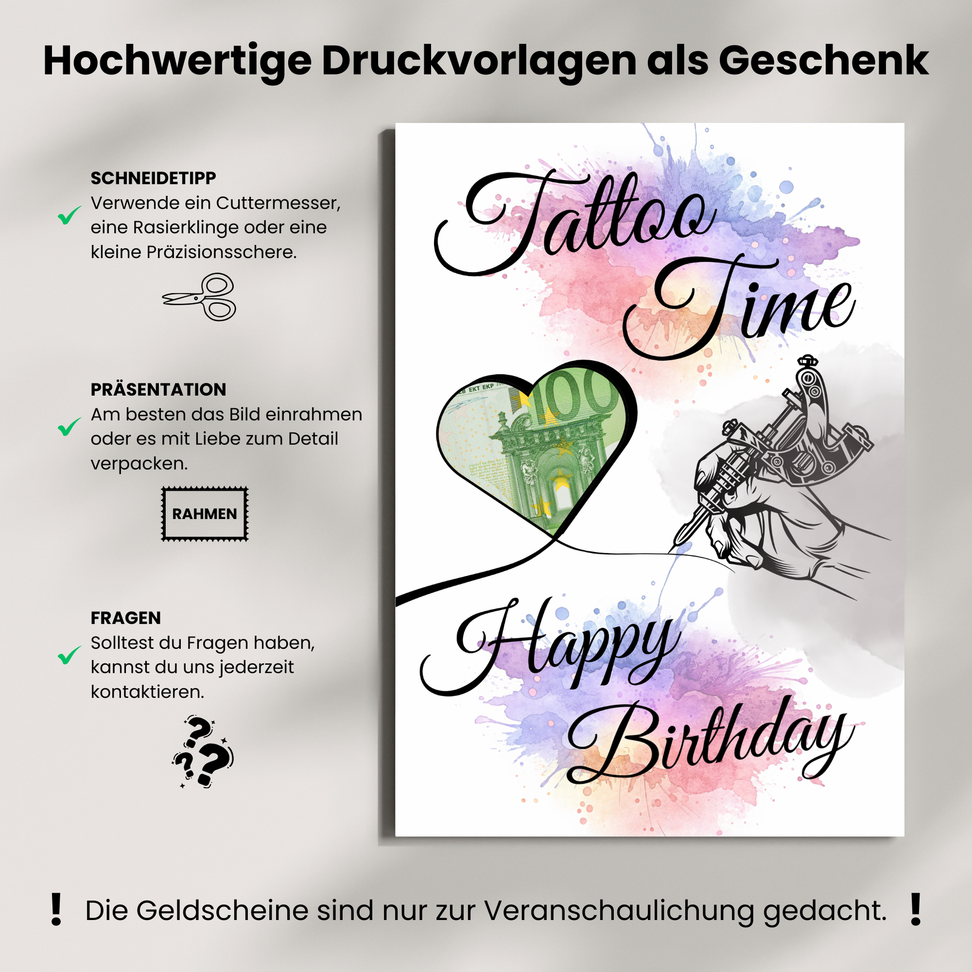 Du brauchst noch schnell ein Tattoo Geburtstagsgeschenk? Dieses Last-Minute-Geldgeschenk ist die perfekte Lösung. Mit seinem ansprechenden Herz-Design eignet es sich ideal, um Geldbeträge stilvoll zu verschenken und dem Beschenkten gleichzeitig eine persönliche Note zu geben. Besonders praktisch ist dieses Geldgeschenk, wenn der Beschenkte bereits konkrete Wünsche hat – wie zum Beispiel ein neues Tattoo. Du unterstützt damit nicht nur finanziell, sondern zeigst auch, dass du die Träume und Ziele des Beschenkten respektierst und förderst. Das Herz-Motiv macht das Geschenk emotional wertvoll und zeigt deine Wertschätzung auf elegante Weise. Ideal für Freunde, Familie oder Bekannte, denen du etwas Bedeutungsvolles schenken möchtest.